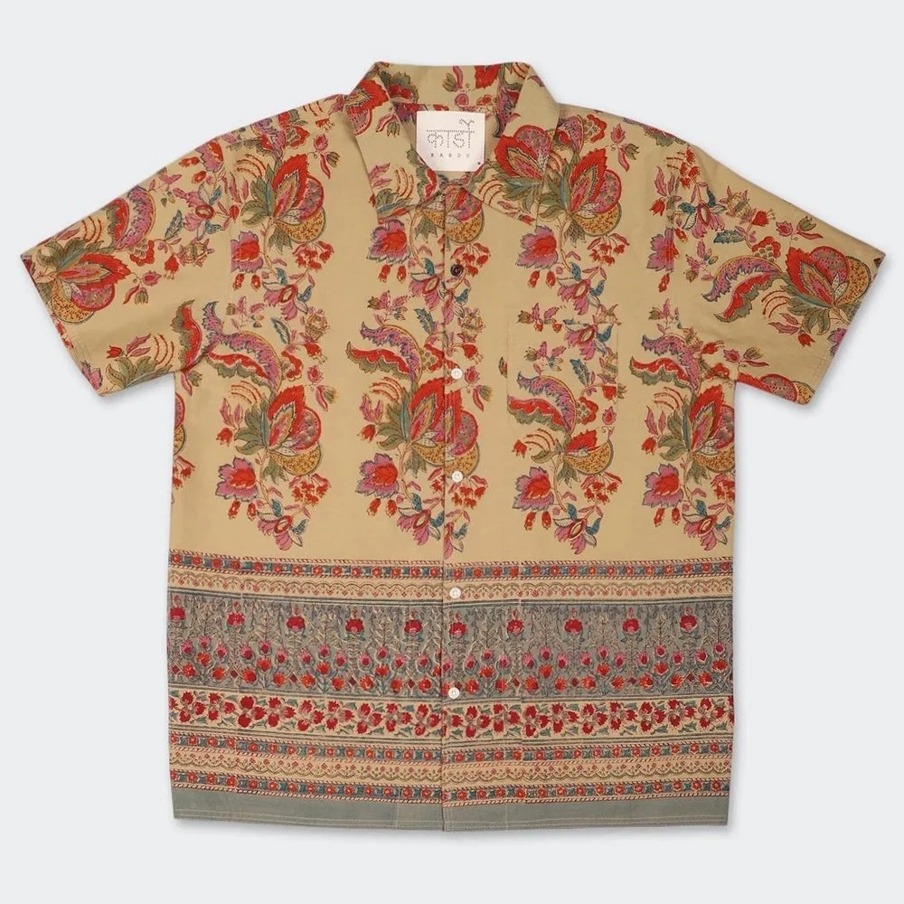 This shirt is a testament to the rich heritage of Indian textile artisanship. Created by Suraj Narain Titanwala, a fourth-generation block printer and natural dyer, it carries forward a legacy rooted in traditional techniques. The natural dyeing process used here is unique, involving hand Kantha stitch embroidery applied post-dyeing by Suraj’s wife Meera Devi and their daughters. This level of craftsmanship ensures that each garment is distinct, with variations that reflect the handmade nature of the product.